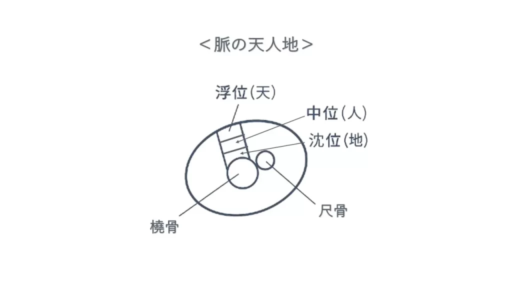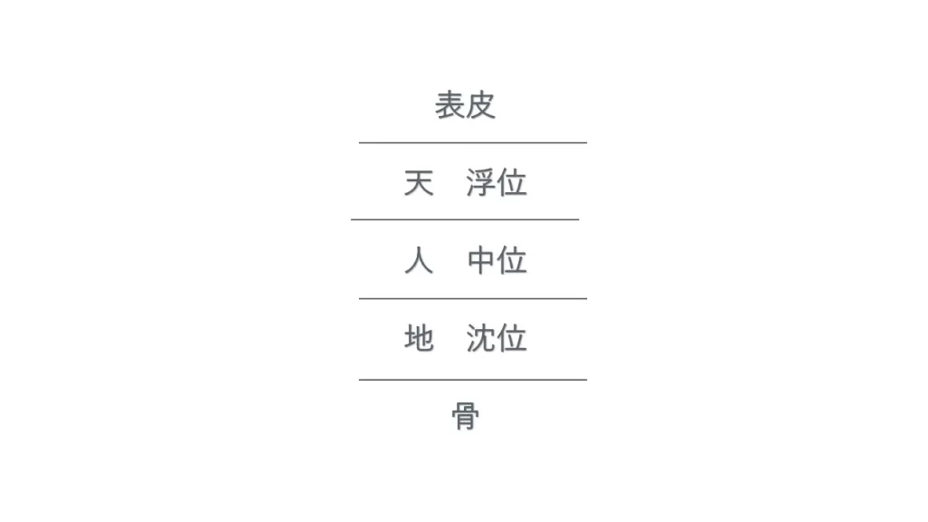 この3つの位置と3つの深さを組み合わせた、合計9つのポイントで脈の状態を詳細に診ることを「九侯の脈」と言います。例えば、軽く触れただけで感じられる脈(浮)は、身体の表面に近い部分の状態を、深く押さえて感じる脈(沈)は、身体の深い部分の状態を示していると捉えることができます。